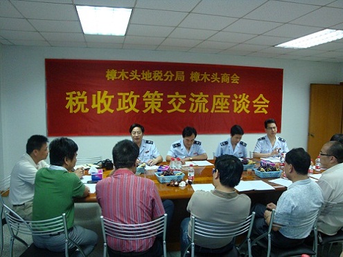 继4月10日的国税座谈会之后,2012年4月24日下午4点,蔡茂林会长带领我们樟木头商会企业有代表性的21家理事会成员,应邀前往地税分局六楼会议室,参加主题为“税收、发展、民生”的 “税企座谈会”。